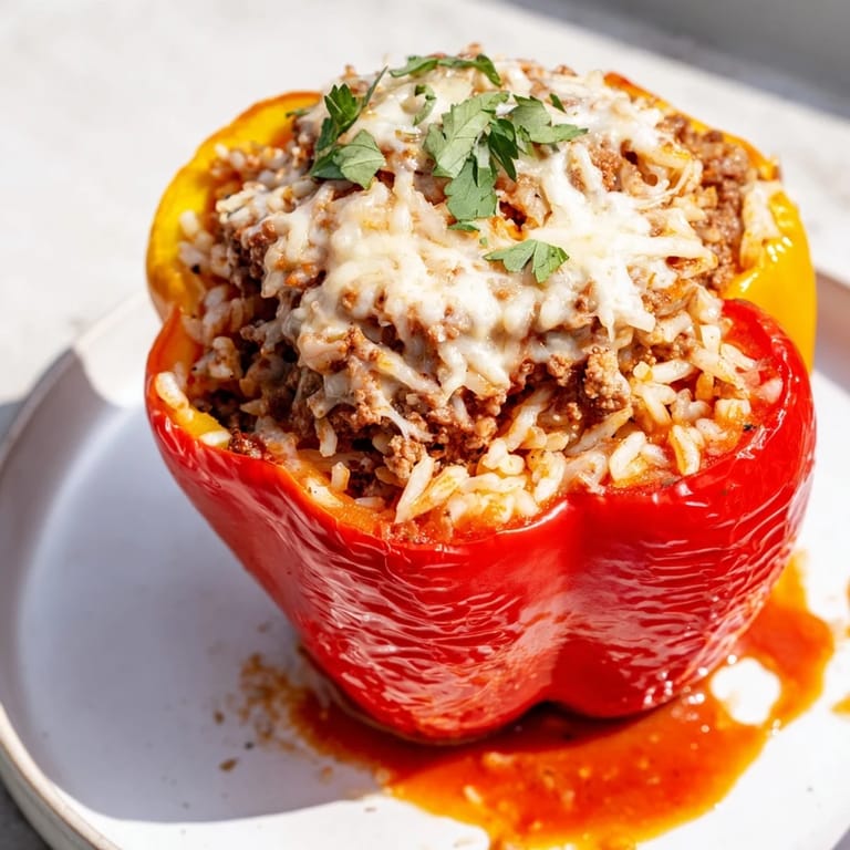 Save My neighbor Maria showed up at my door one autumn evening with four enormous bell peppers from her garden, insisting I needed to learn her family's stuffed pepper recipe. I was skeptical—ground beef and rice sounded so simple—but watching her work, I realized the magic wasn't in complexity but in that moment when the filling gets tucked into each pepper like a small gift, then gets cradled in tomato sauce while the oven does all the heavy lifting. That night, my kitchen smelled like rosemary and caramelized onions, and I understood why she'd been so adamant about sharing this with me.